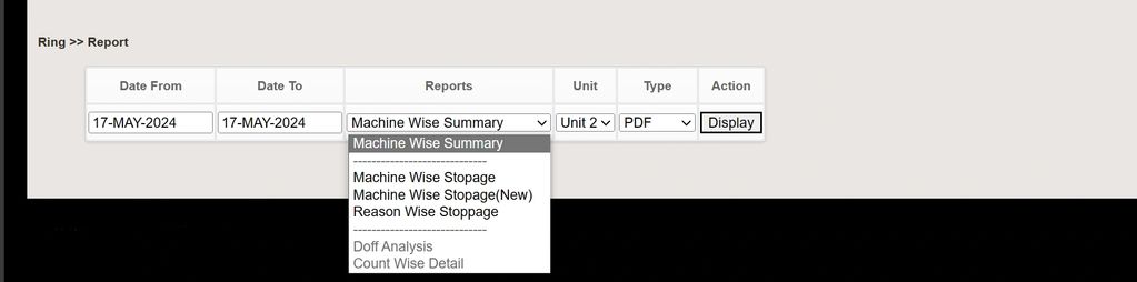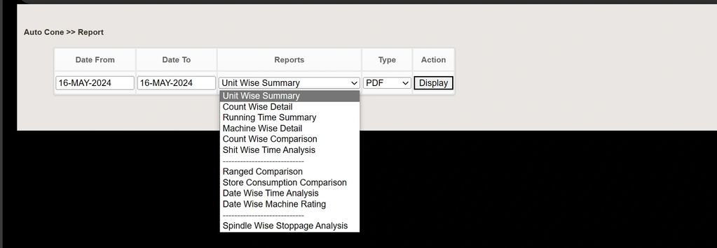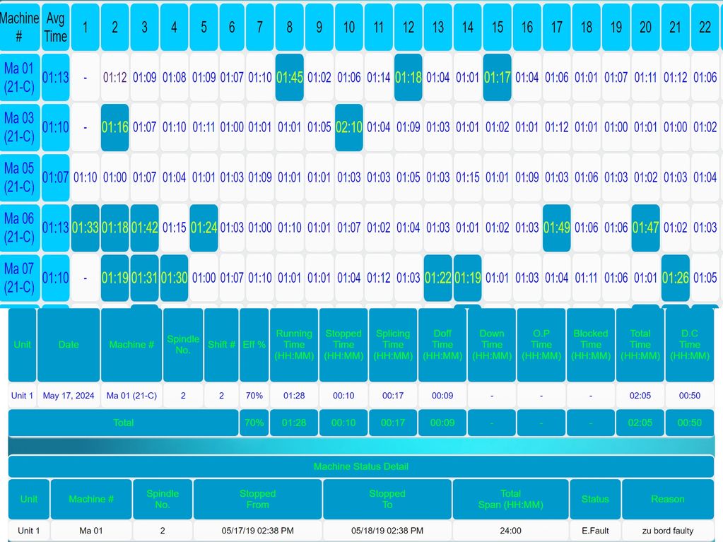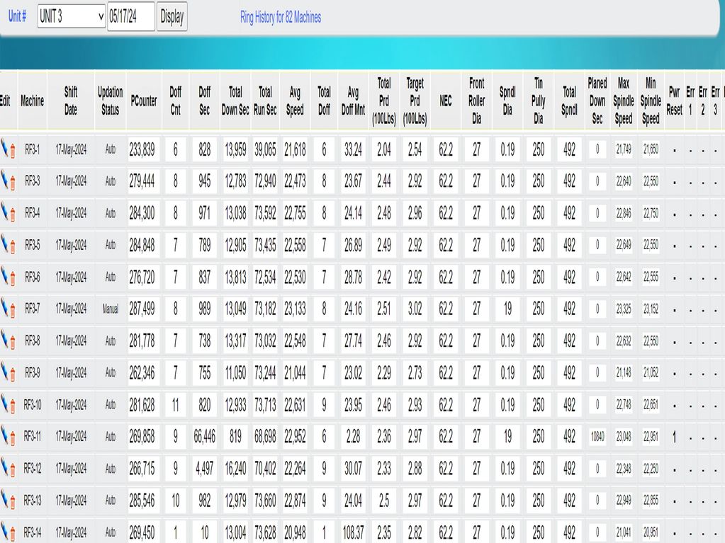 A comprehensive data base of each ring frame history. Easy query to generate a detail analysis for each machine for each day.