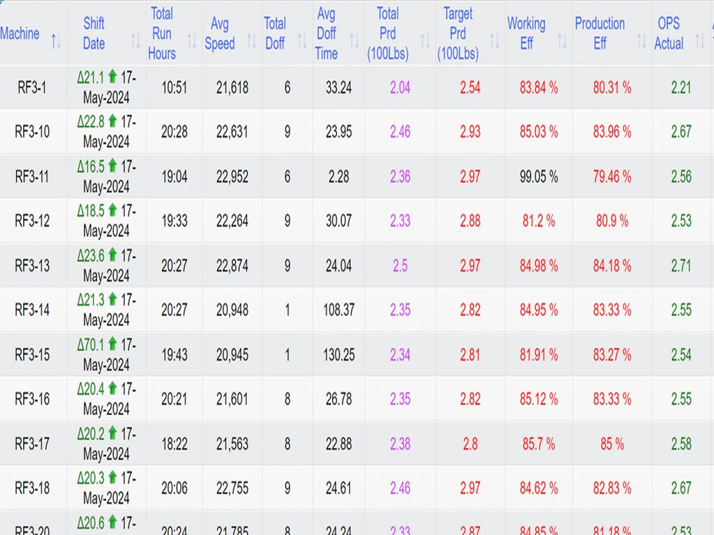 Get live doff times, doff durations, OPS, etc., for each machine along with comparative indictors for performance improvement.